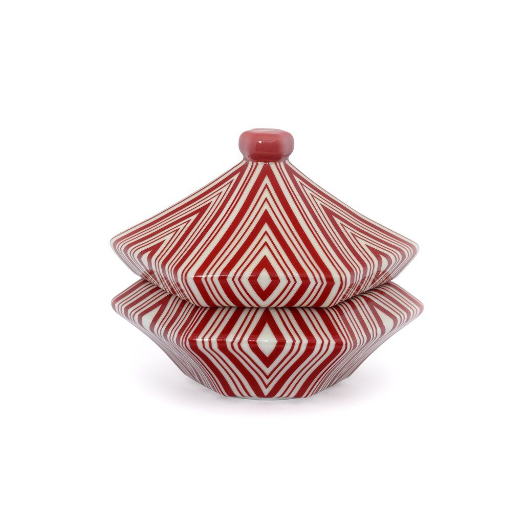 Získejte tento jedinečný kousek českého kubismu a přineste do svého domova kousek historie a umění. Šestiboká červená dóza s víkem je ideálním dárkem pro všechny milovníky kvalitního designu a historie.